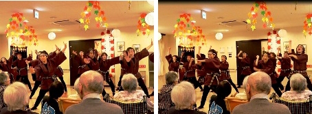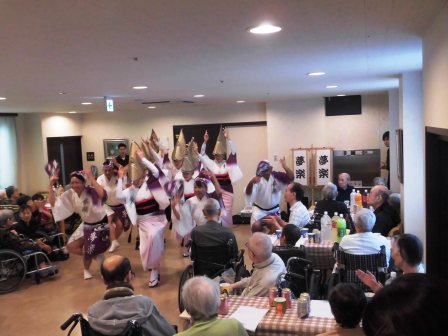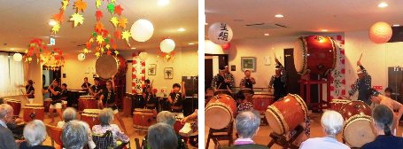 大人たちの越谷龍虎太鼓の皆様の演奏は、室内ということで、入居者の皆様が