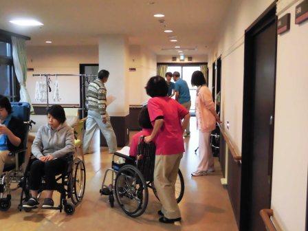 ※最近、大阪でのビル火災の際に「煙」で多数の方が亡くなったことを踏まえ、2階や3階の避難も同時に行うべきではないかとの意見があった。また、当施設だけの火災の場合には、越谷市の屈強な消防隊員が大勢助けに来て下さるので、ベランダへの避難を優先すべきとの方針ですが、大震災などで周辺地域も被災した場合には、消防隊員が来てくれないことも想定されるので、自分たちだけで、入居者全員を守る方策も必要ではないか、などの意見があった。