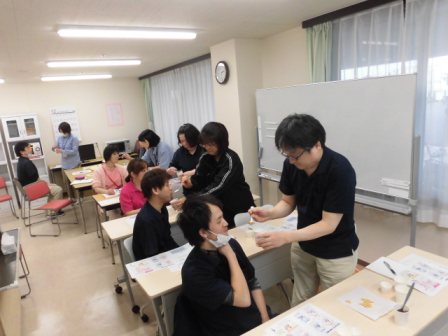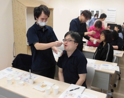 講義中、随時、飲み込みの体験、食事介助される体験をしました。