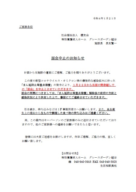 また、令和3年2月2日の緊急事態宣言の延長に伴い、面会制限の期間も延長致します。