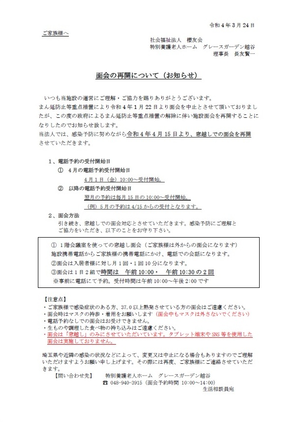 令和4年1月21日の「まん延防止等重点措置」の発令に伴い「窓越し面会」を中止しておりましたが、まん延防止等重点措置の解除に伴い、令和4年4月15日(金)より「窓越し面会」を再開させていただきます。下記をご参照下さい。